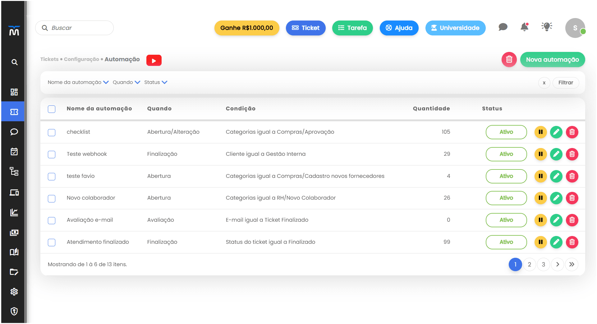 Um sistema de automações precisa ser fácil de administrar, especialmente quando você começa a criar várias regras para vários cenários. Por isso, a Milvus traz uma visão central com status “ativo”, controle de pausa e ações rápidas de edição e exclusão.