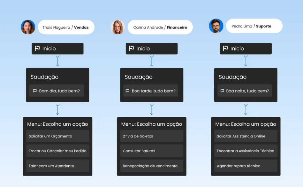 Tenha múltiplos chatbots trabalhando para você! Crie fluxos de atendimento automáticos para as áreas de Vendas, Pós-vendas, Financeiro e mais.