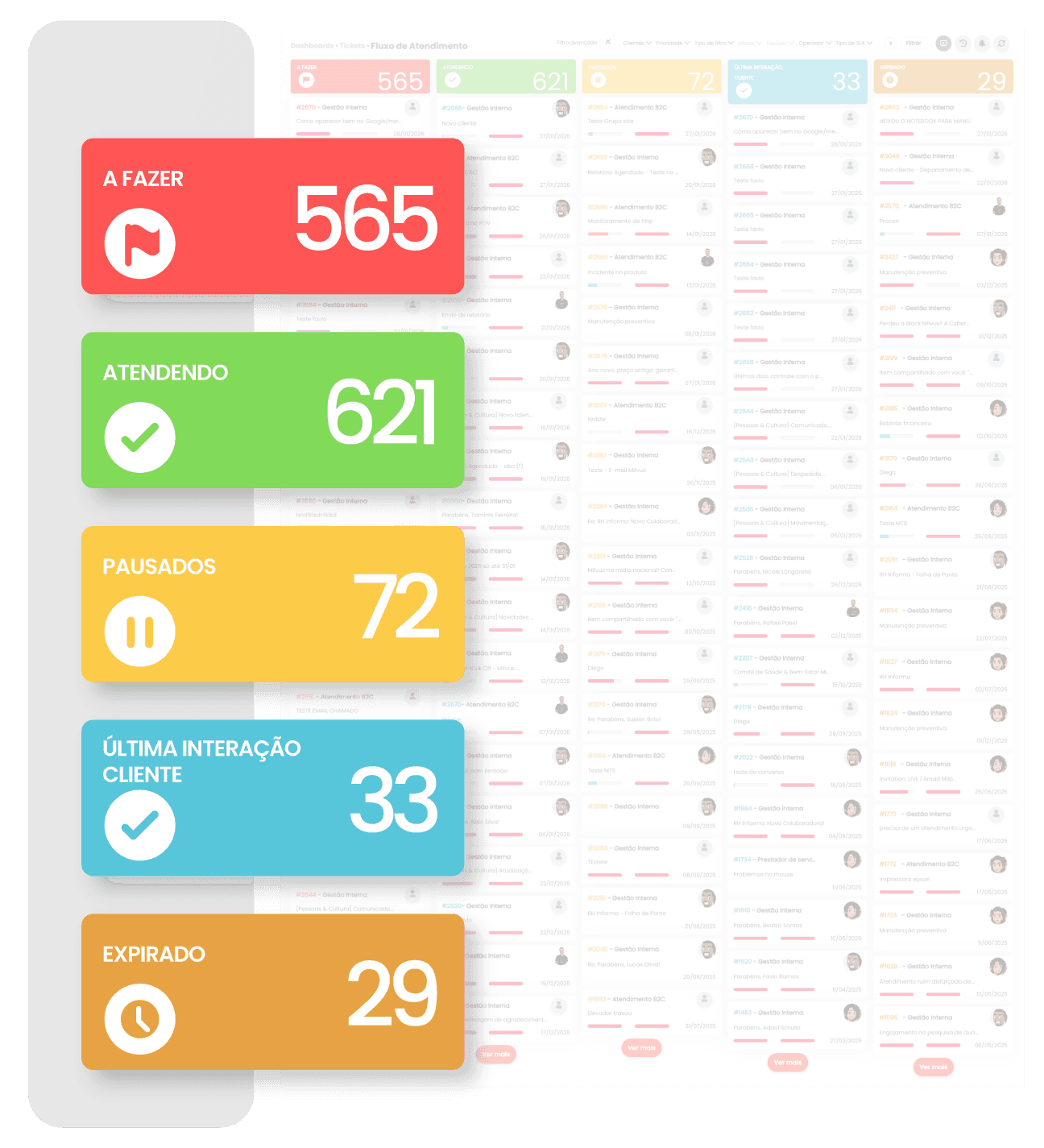Tenha uma visão completa do seu fluxo de tickets em um único painel. O Milvus consolida os principais status da operação (aguardando aprovação, a fazer, em atendimento, pausados, abertos, retidos, expirados, conferências e meus tickets) para você entender rapidamente onde está o volume e o que está travando.